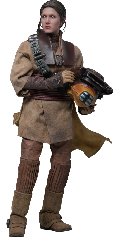 Hot Toys is proud to present the Leia Organa (Boushh Disguise)™ Sixth Scale Collectible Figure. The  figure features a newly developed helmeted head with detailed weathering, as well as a separate unhelmeted head sculpt of Carrie Fisher as Leia, complemented by separate rolling eyeballs, a lifelike expression, and a meticulously sculpted low braided bun hairstyle.